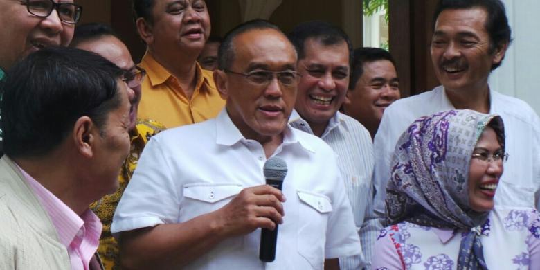Ketua Umum DPP Partai Golkar Aburizal Bakrie berbicara kepada wartawan seusai melakukan pertemuan dengan para pimpinan DPD I Golkar di kediamannya, Jakarta Pusat, Senin (25/8/2014)